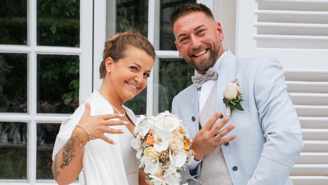 Wenn zwei Menschen sich anschauen, wie frisch Verliebte lachen und dabei ganz stolz ihre Eheringe in die Kamera halten, dann ist klar: Hier wurde nicht nur geheiratet, hier wurde die Liebe gefeiert! Und wir sagen: Herzlichen Glückwunsch!